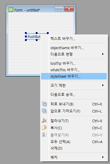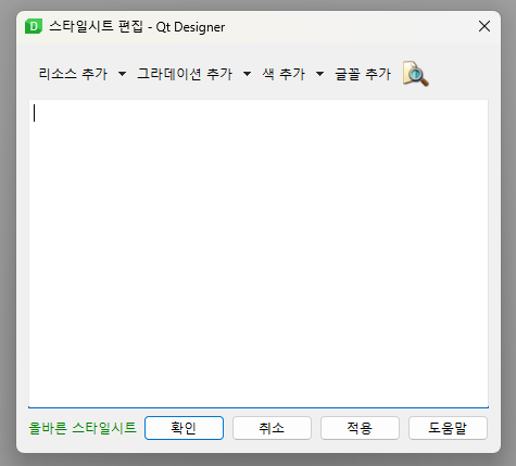 styleSheet는 Designer에서 마우스 우클릭 styleSheet 바꾸기에서 설정할 수 있습니다.