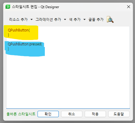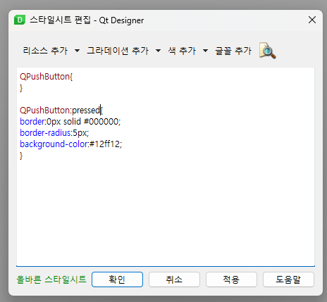 PushButton이 클릭되었을 때 스타일시트를 적용하는 방법입니다.