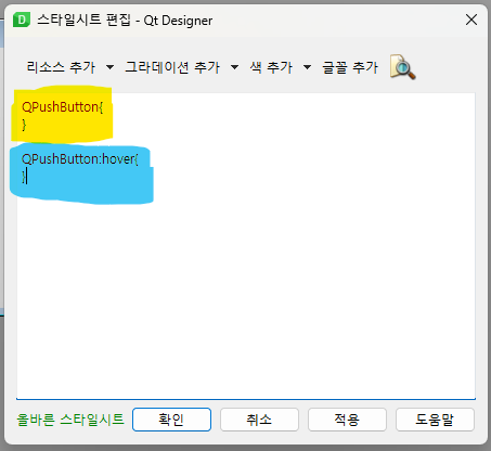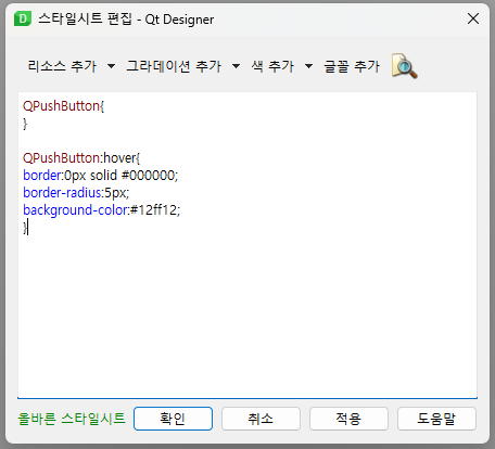 hover는 QPushButton에 마우스가 hover했을때 디자인을 변경할수 있습니다.