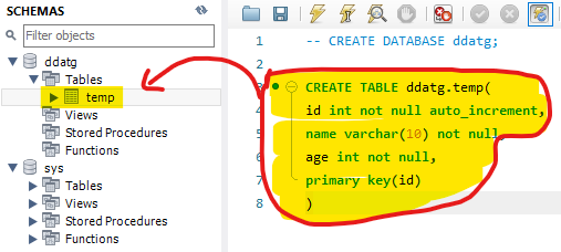 ddatg라는 데이터 베이스에 temp라는 테이블을 생성,